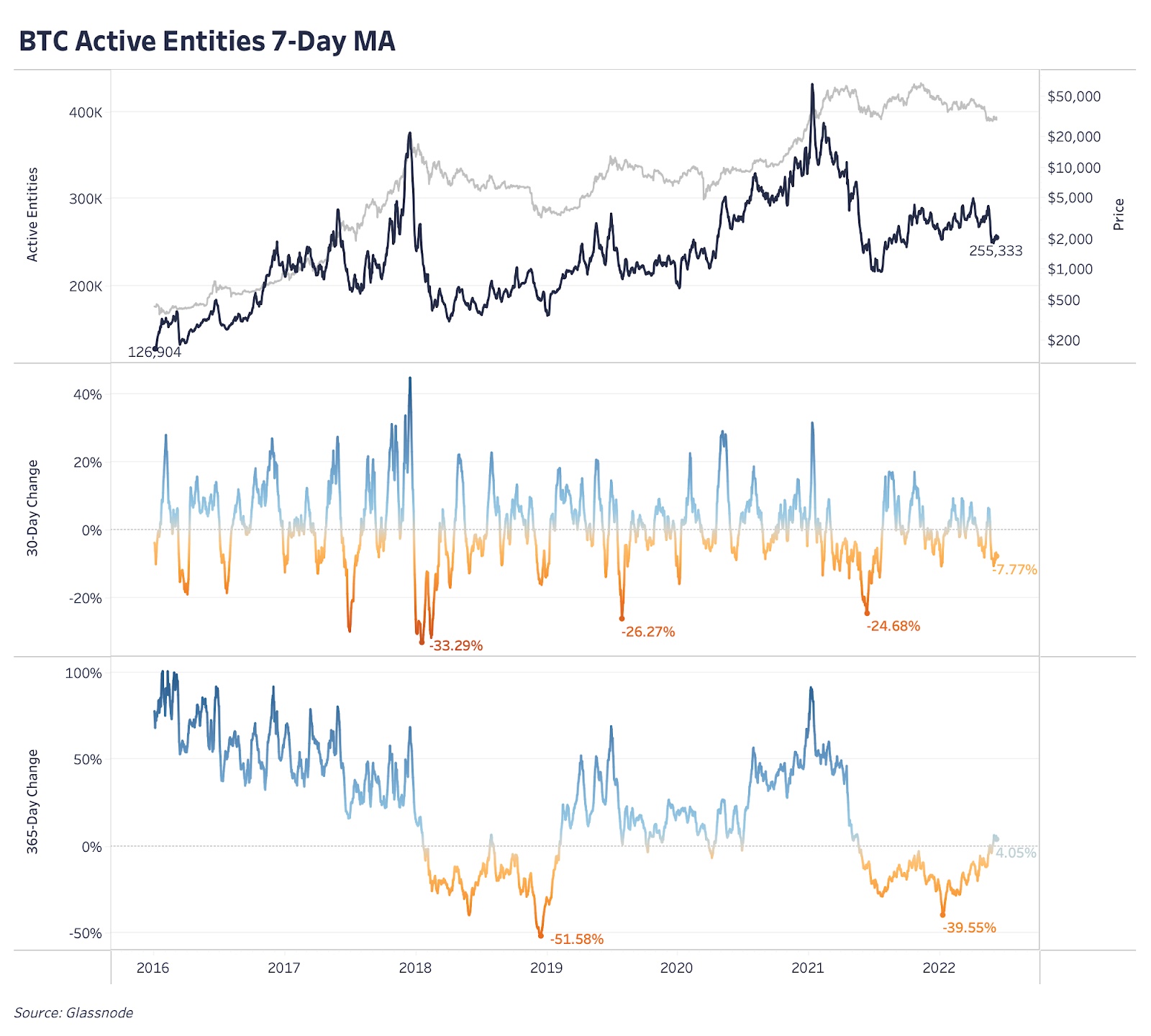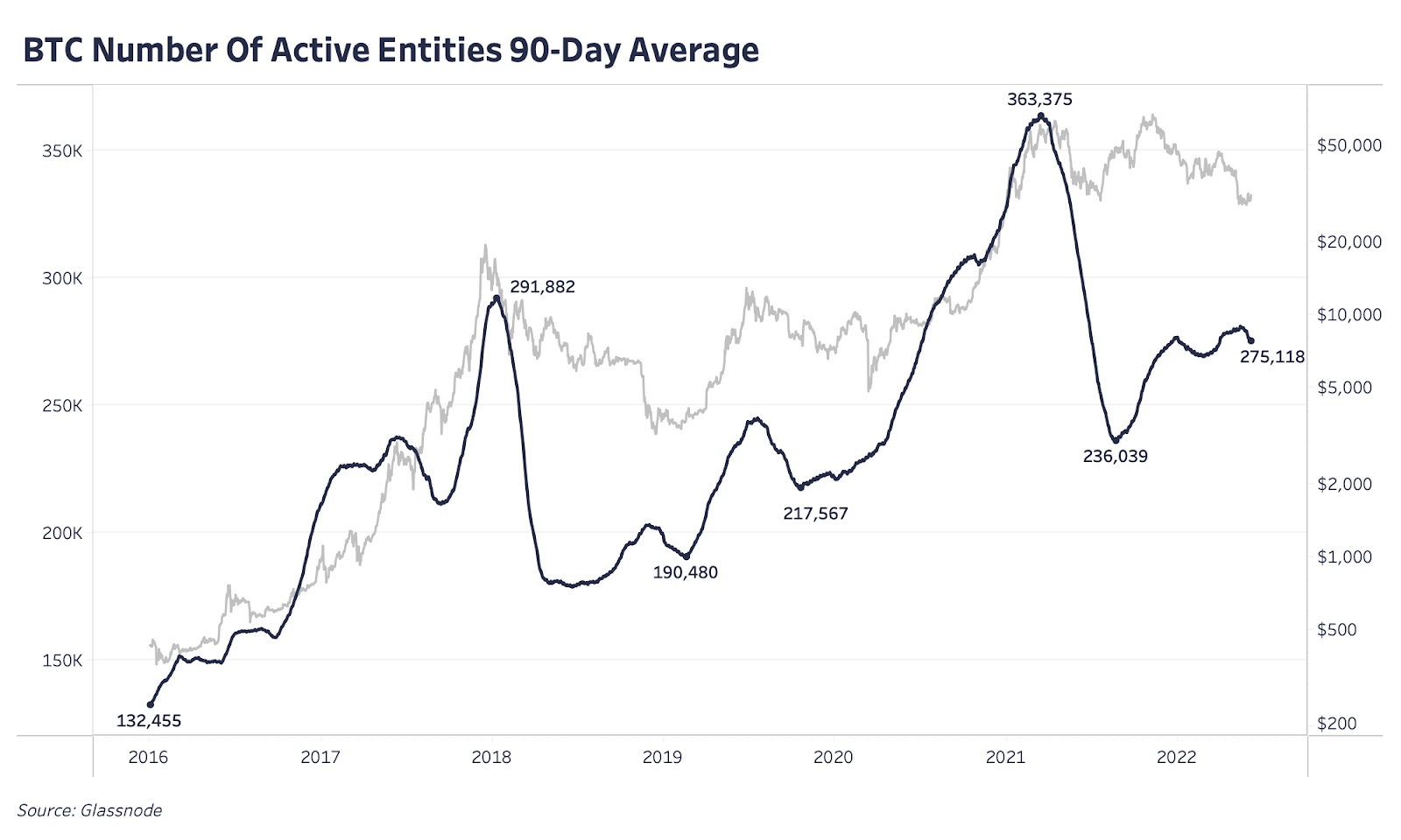 Одним из таких ключевых показателей является рост числа активных субъектов сети. Субъекты сети — это определяемые методами блокчейн-анализа кластеры адресов, управляемых одним частным лицом, организацией или иным участником рынка. «Активный» субъект определяется как тот, кто отправлял или получал биткойны в тот или иной день. Этот показатель основывается на методах анализа данных и эвристических правилах, применяемых поставщиком данных (в данном случае Glassnode), и он не идеален, однако хорошо себя зарекомендовал для отслеживания изменения спроса со временем. Подробнее о методологии Glassnode можно прочитать здесь: оригинал / перевод.
