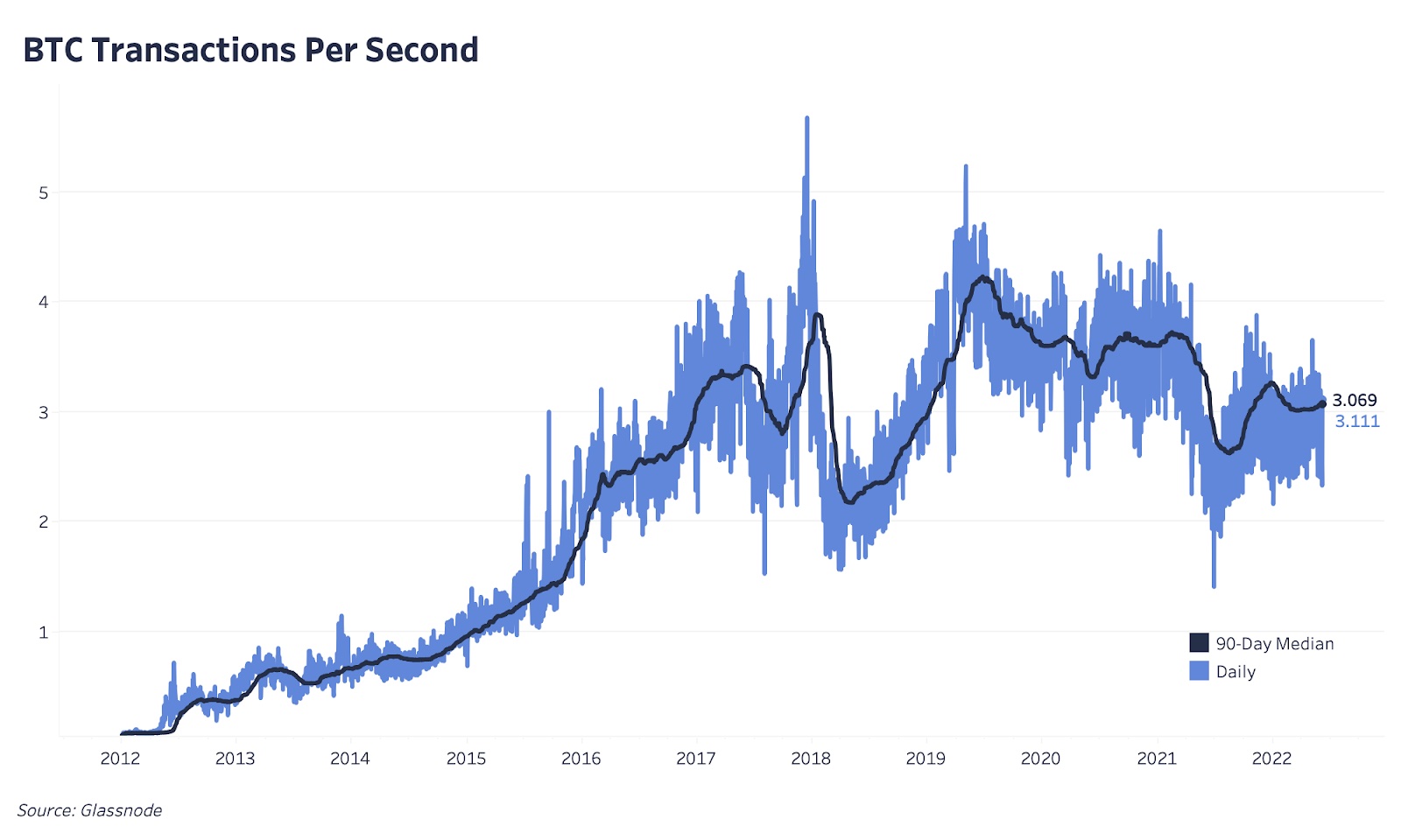 Наконец, важно отметить, что базовый слой Биткойна уже не дает полного представления об общем уровне принятия и распространения сети, поскольку всё больше пользователей пользуются сервисами и приложениями, не подразумевающими прямого взаимодействия с блокчейном для каждой транзакции. Примеры таких сервисов включают кастодиальные биржи (принимающие на хранение средства пользователей), такие как Coinbase, где покупка или продажа пользователями BTC не обязательно подразумевает движение «монет» ончейн, если только это не вывод средств.