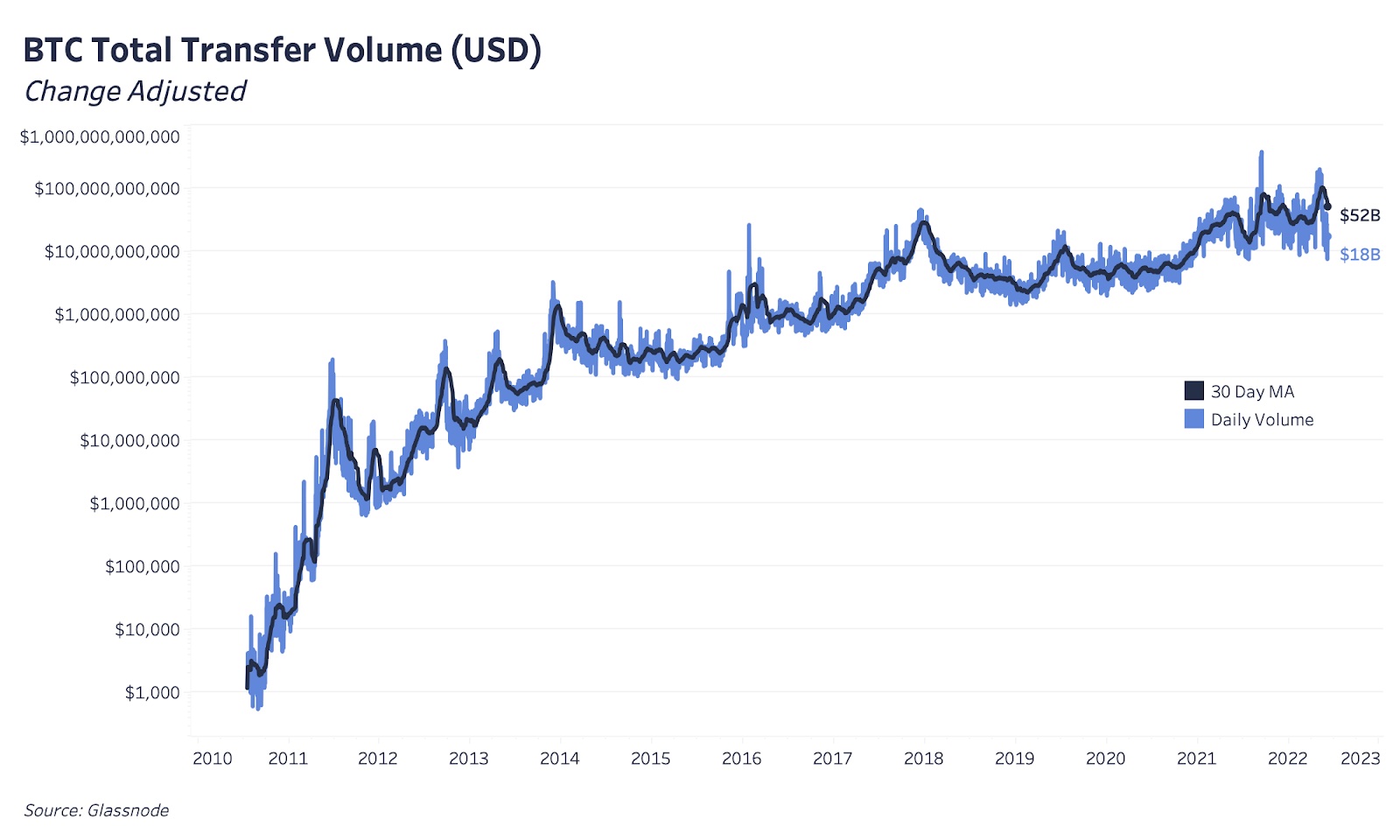 Несмотря на высокую волатильность, во многом обусловленную амплитудой ценовых движений, коэффициент NVT обнаруживает явный тренд: ценность сети Биткойна со временем повышается. Значения выше линии тренда говорят о том, что рынок, по-видимому, «переоценен», ниже линии тренда — «недооценен». С февраля, под давлением макроэкономических факторов, биткойн с точки зрения фундаментального анализа был «недооценен», учитывая объем ончейн-транзакций.