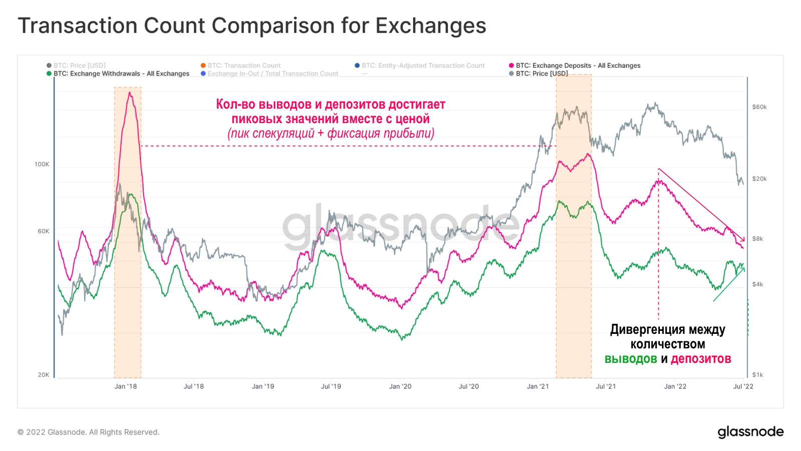 Вообще говоря, количество транзакций как депозита, так и вывода «монет» имеет тенденцию расти вместе ценой, достигая пика в районе максимумов бычьего рынка, при наибольшем притоке спекулятивного спроса. Количество транзакций вывода BTC с бирж (зеленый график) в норме несколько ниже по сравнению с транзакциями депозита (розовый график). Это связано с тем, что биржи обрабатывают вывод средств несколькими клиентами в одной транзакции, тогда как депозиты —это всегда отдельные транзакции.
