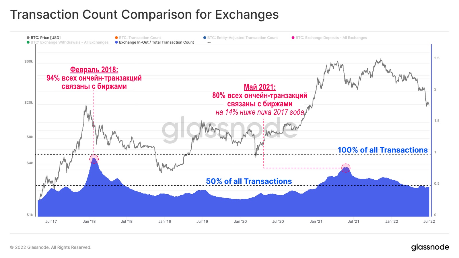 Можно оценить также долю ончейн-транзакций, связанных с биржами, по сравнению с общим объемом ончейн-транзакций в сети. Это помогает определить пики и спады в активности инвесторов и выявить изменения в базовой структуре рынка.