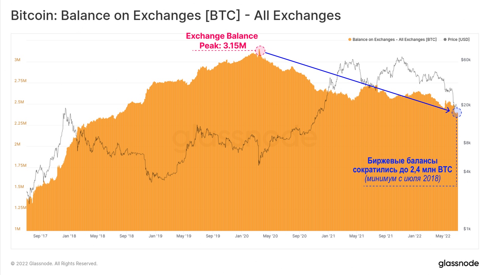 Наряду с исторически значимым снижением курса BTC в июне, кошельки криптобирж претерпели крупнейшее в истории месячное сокращение балансов BTC с оттоком 150 тыс. BTC/мес. Это означает сокращение биржевых балансов на 5–6% за июнь и резко контрастирует с притоком монет на биржи в мае – июне 2021 года.