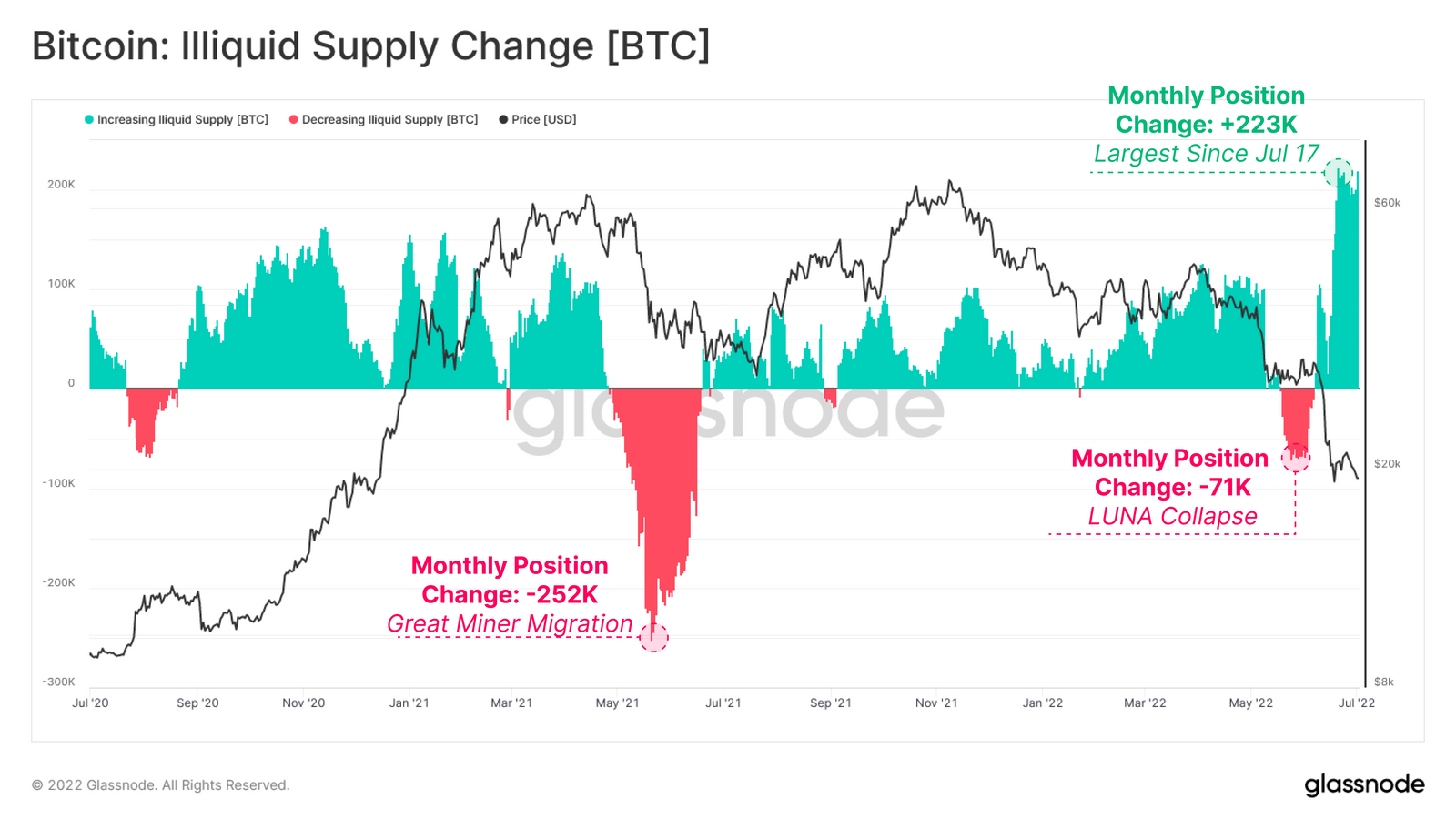 Крупнейшее сокращение чистой позиции биржевых кошельков за всю историю наблюдений дополняется крупнейшим изменением неликвидного предложения с июня 2017 г. Неликвидное предложение в июне увеличилось на 223 тыс. BTC, отражая масштабное движение монет в направлении кошельков с практически нулевой историей расходования.