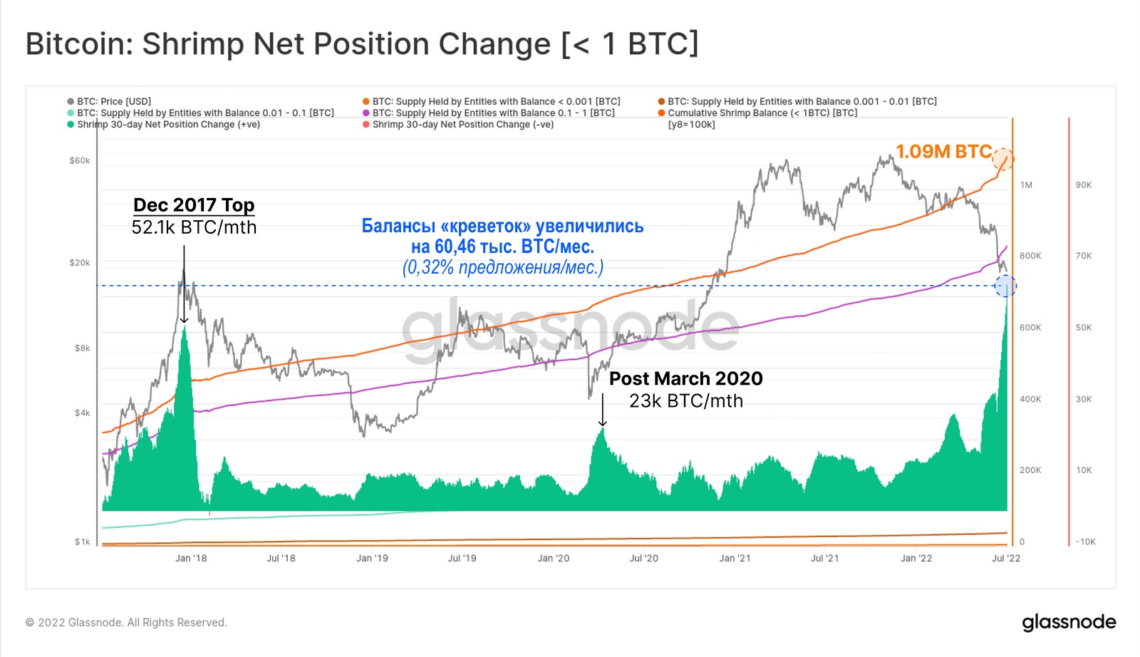 Углубляясь в эту динамику, видно, что мелкие инвесторы пополняют свои балансы со скоростью 60,46 тыс. BTC в месяц, и это самая агрессивная скорость накопления в этой когорте за всю историю рынка, эквивалентная 0,32% оборотного предложения в месяц. Интересно, что темпы накопления со стороны мелких «креветок» превосходят даже предыдущий рекорд, установленный в декабре 2017 г., на пике того рыночного цикла.