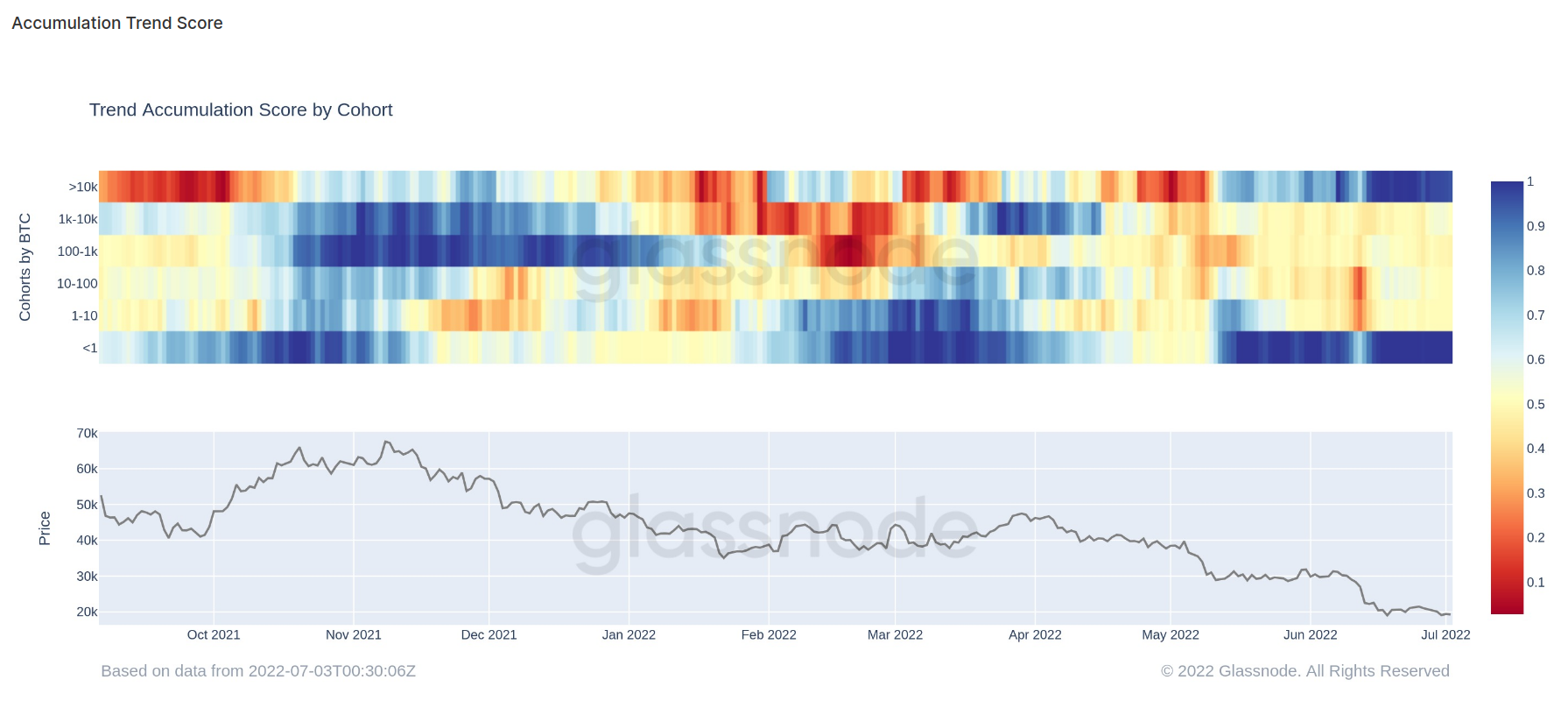 Вместе с сокращением общего биржевого предложения BTC, можно наблюдать агрессивное накопление со стороны как крупнейших (>10 тыс. BTC), так и наименьших (<1 BTC) участников рынка. И «креветки», и «киты», с середины мая демонстрируют близкие к максимальным значения Accumulation Trend Score (синий цвет), указывающие на последовательный и значительный рост их ончейн-балансов.