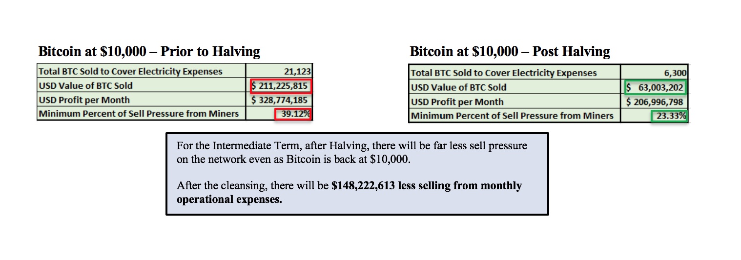 Во время капитуляции майнеров сложность майнинга падает, и более приспособленные майнеры получают возможность «добывать» больше BTC. На рынке остаются наиболее эффективные майнеры с самыми низкими эксплуатационными затратами. Это было четко артикулировано в этом исследовании от Blockware Research, где говорилось о месячном снижении давления продаж на $148 млн, ожидавшемся после халвинга 2020 года.