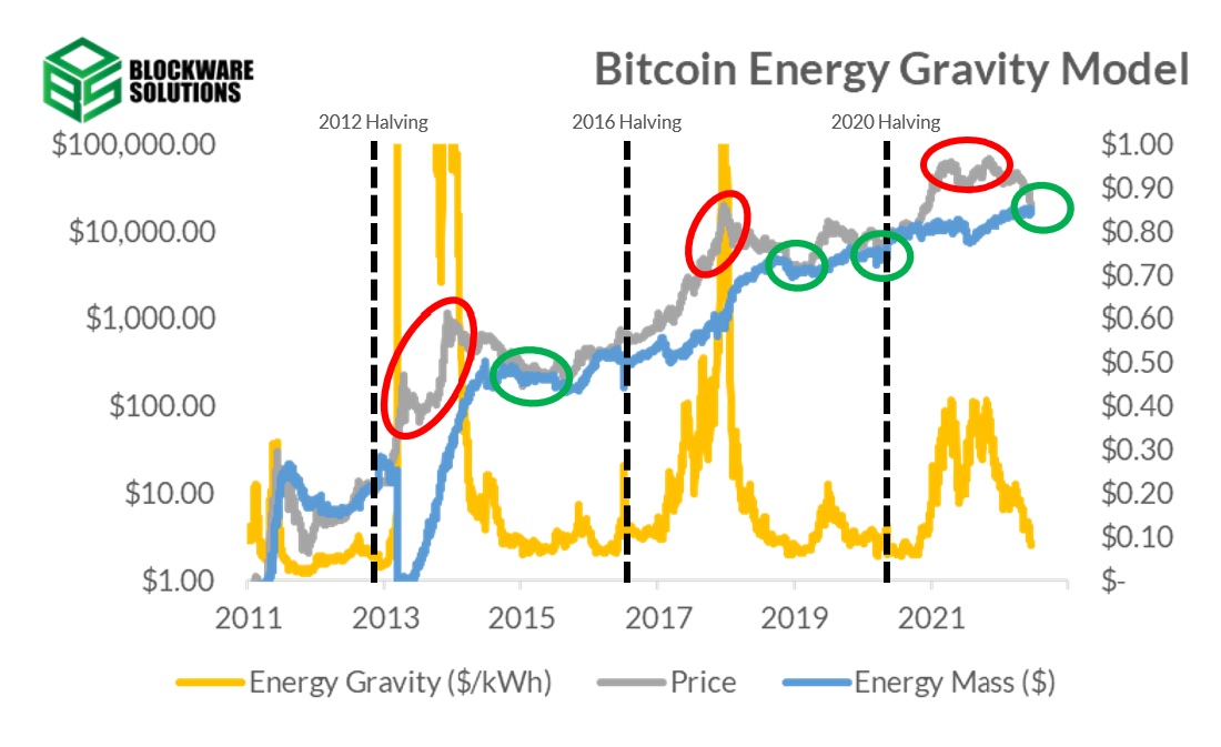 Зелеными кругами на графике ниже отмечены капитуляции майнеров, спровоцированные биржевым курсом BTC. Это происходит, когда энергетическая гравитация слабая, а энергетическая масса (производственные издержки) уменьшается из-за капитуляции более слабых майнеров, снижая сложность сети.