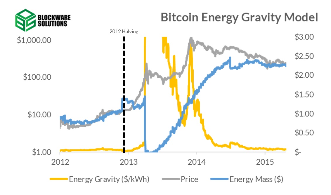 Высокая гравитация не значит, что цена не может резко вырасти в краткосрочной перспективе, как это случилось позже в том же 2013 году. Так происходит потому, что сама гравитация является функцией времени. В физике гравитация Земли составляет 9,8 м/сек. ^ 2. Ускорение объектов занимает время. Так же и с гравитацией Биткойна. В краткосрочной перспективе цена может продолжать расти под действием сильного спроса, но самой гравитации (энергетическому арбитражу на майнинге) требуется время для сближения двух цен.