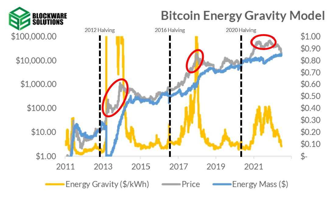 Общая макроэкономическая неопределенность и высокая инфляция могут привести к беспрецедентному притоку капитала как в BTC, так и в майнинг (курс биткойна и энергетическая инфраструктура быстро растут в тандеме). Гипербиткойнизация, вероятно, совпадет с быстрым ростом номинальных цен на энергоносители. Если стоимость производства начнет расти из-за роста цен на энергоносители, то гравитация (арбитражная возможность) уже не вернется, и стоимость BTC как в долларах, так и в кВт-ч, может увеличиться.