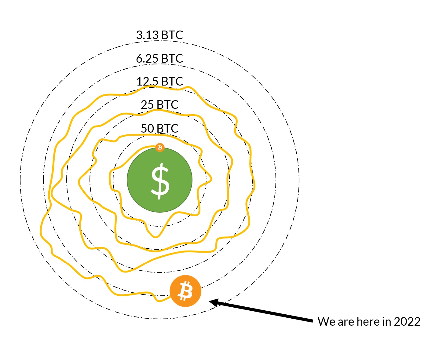 По мере того как субсидия на блок Биткойна каждые ~4 года алгоритмически сокращается (50 BTC, 25 BTC, 12,5 BTC и т.д.), майнеры присоединяются к сети, время идет и принятие пользователями ускоряется, Биткойн становится всё в меньшей степени привязан к долларовой системе.