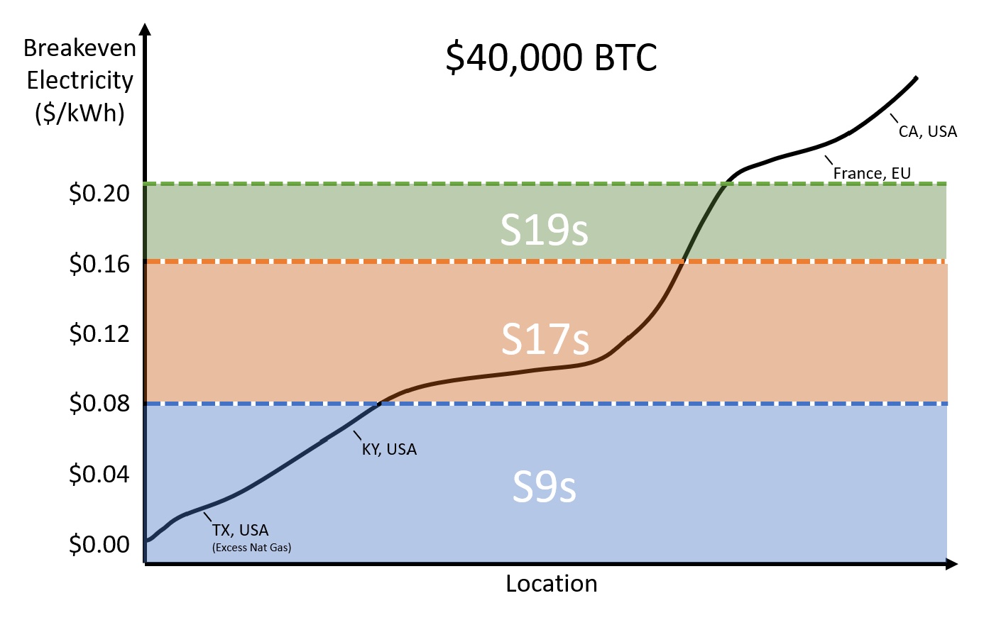 Энергетическая гравитация: максимальная долларовая стоимость электроэнергии ($/кВт-ч), при которой майнинг на современных моделях ASIC остается прибыльным. («Современные модели» здесь определяются по средней эффективности [Дж/Тхеш] лучших майнинговых установок за последние два года.)