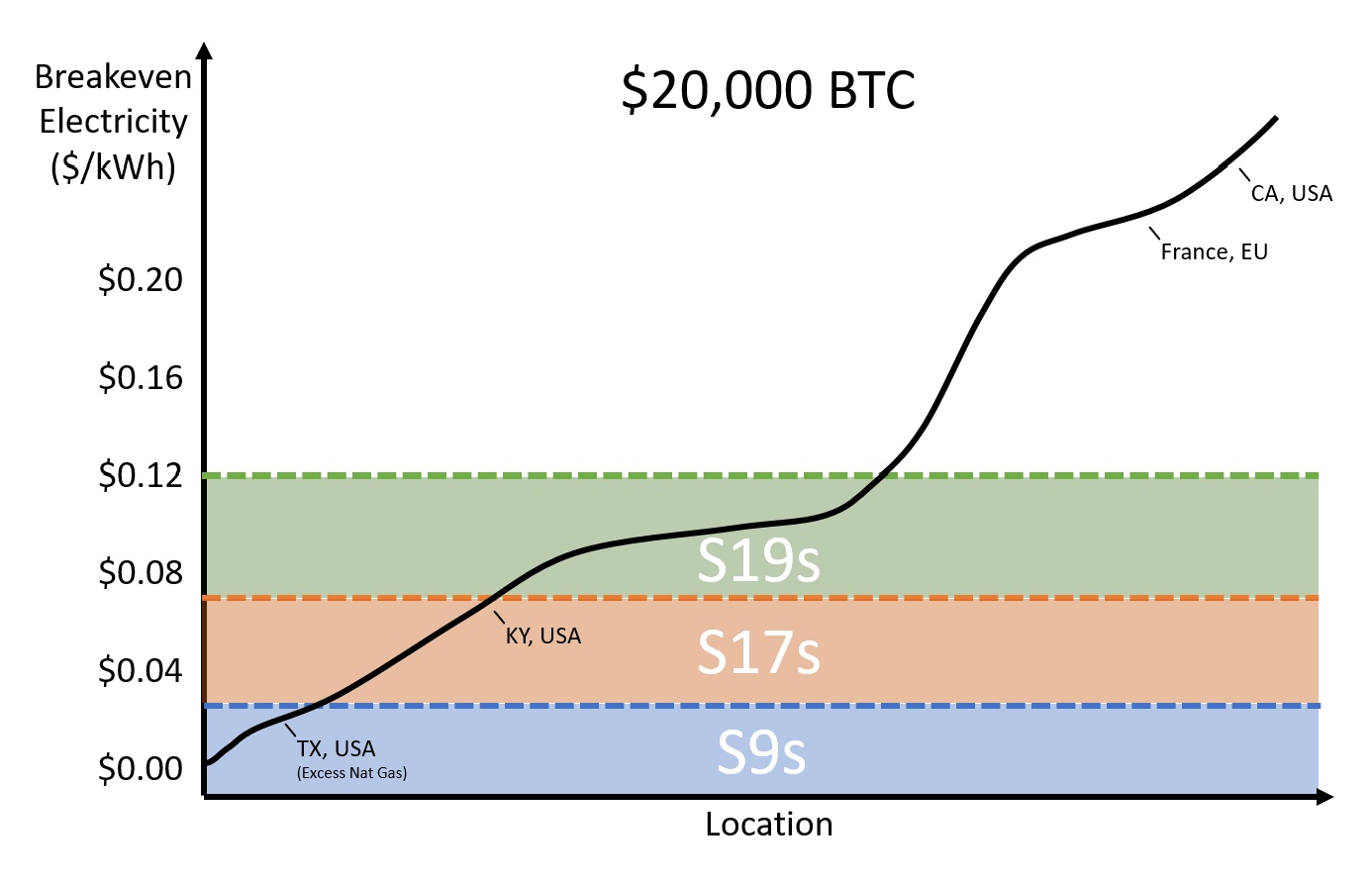 Какова безубыточная стоимость ($/кВт-ч) электроэнергии для майнинга BTC на современном оборудовании?